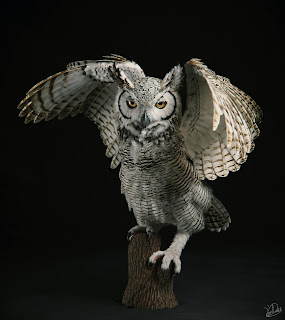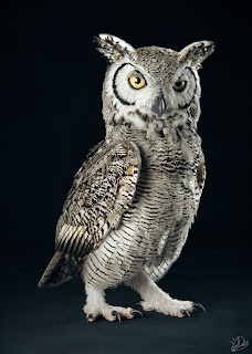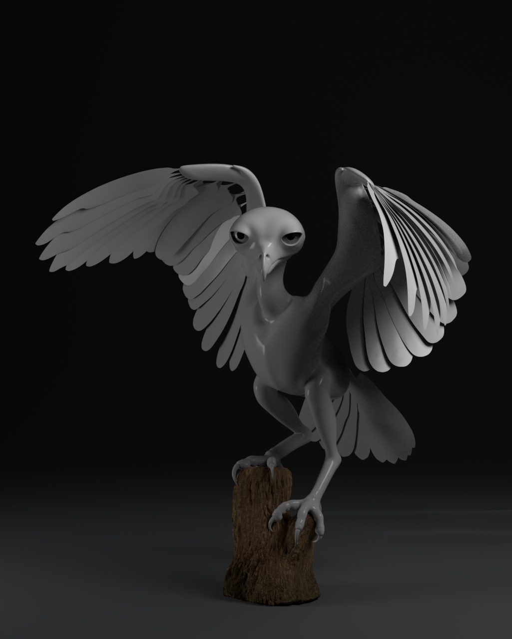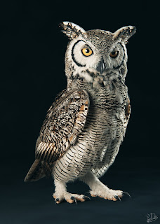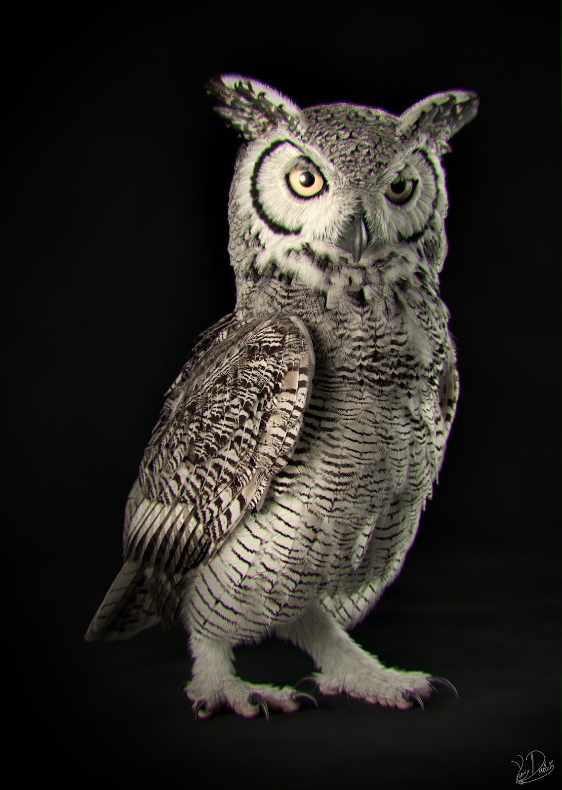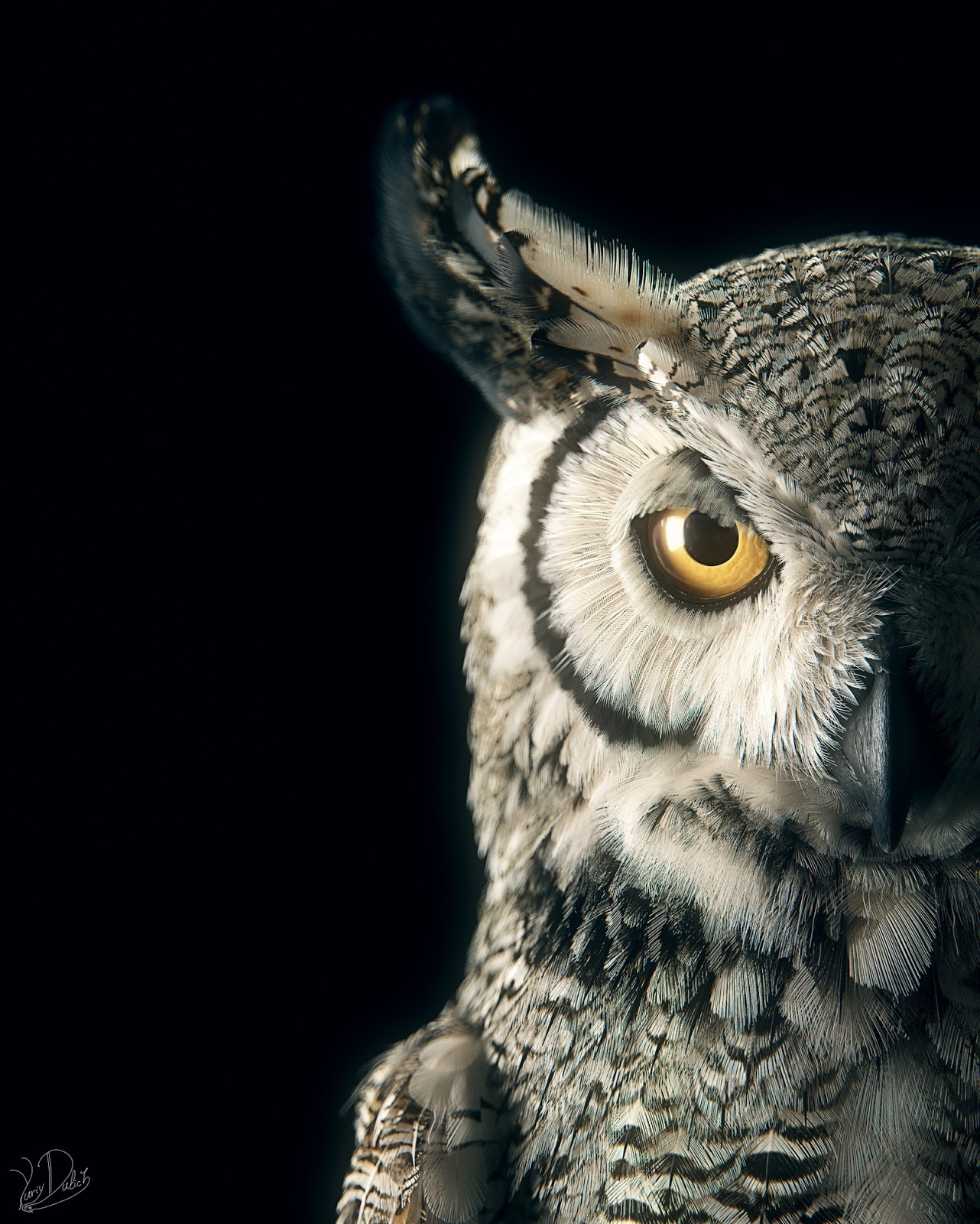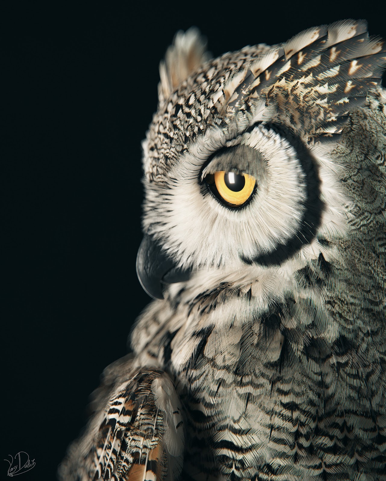 In this project, I tried to create a photorealistic and anatomically accurate model of Subarctic Great Horned Owl. All grooming and scattering works of feathers I used Yeti, the owl has real fiber feathers (total count feathers - 6327 and 2188922 fibers) and I didn't use any poly plane feathers. As always, for shading, I used melanin centric Arnold Hair shader with a complex network.